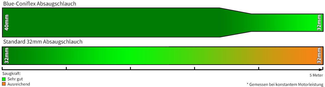 * Die Blue-Industrial Absaugschläuche haben einen größeren Innendurchmesser (40mm) als der Standard 38mm Absaugschlauch. Daher haben die 5 Meter langen Blue-Industrial Absaugschläuche fast die gleiche Saugkraft und Luftdurchsatz wie der kürzere 2,5 Meter lange Standard 38mm Absaugschlauch.